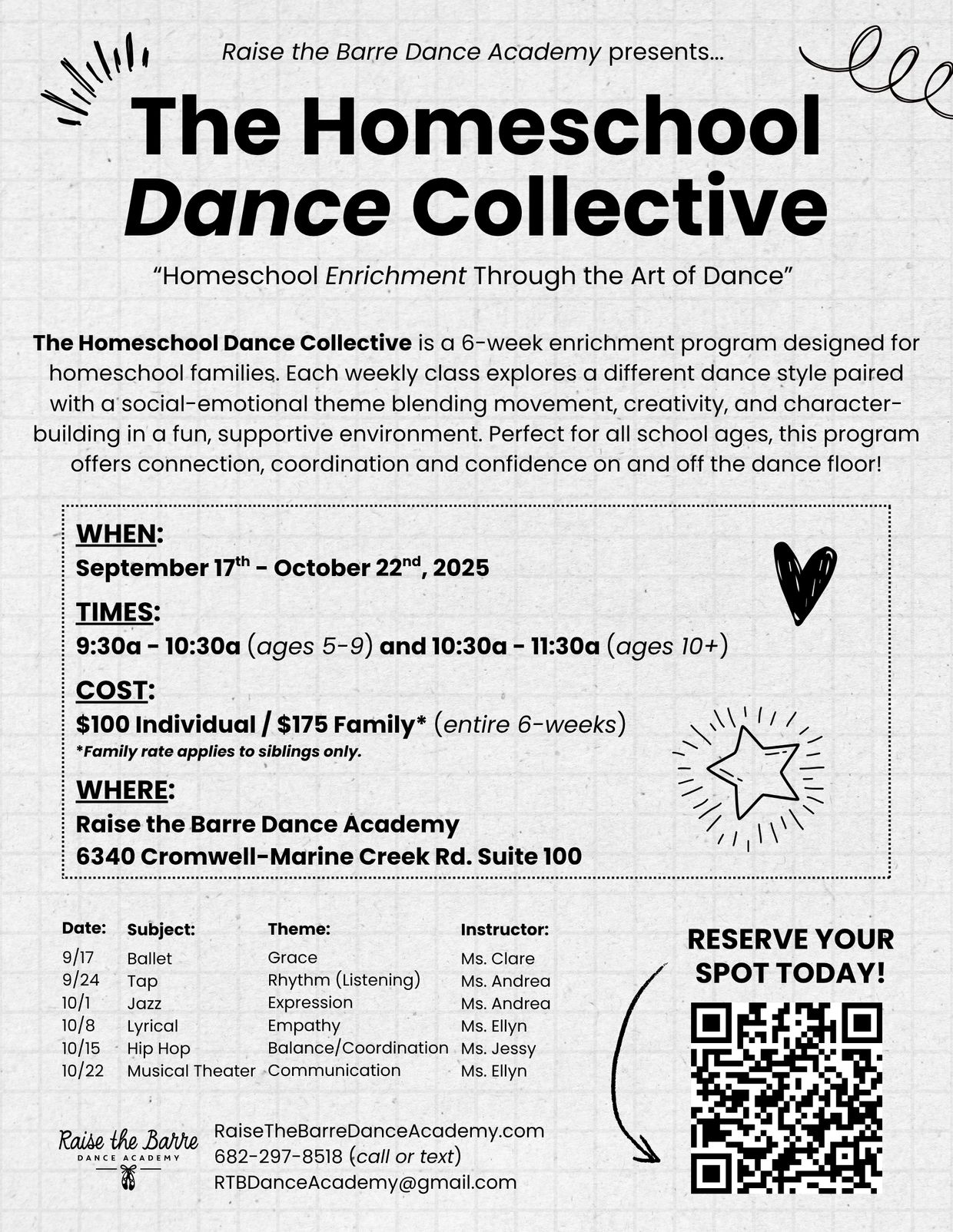 Students will explore the rich history and foundations of dance styles and techniques, while also developing essential life skills and character traits that extend beyond the studio. No dance experience is necessary, just a willingness to move, learn, and grow!